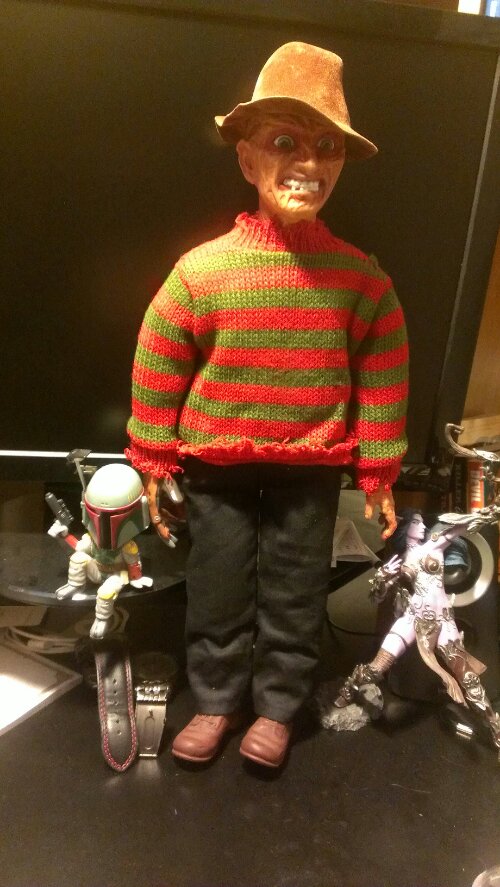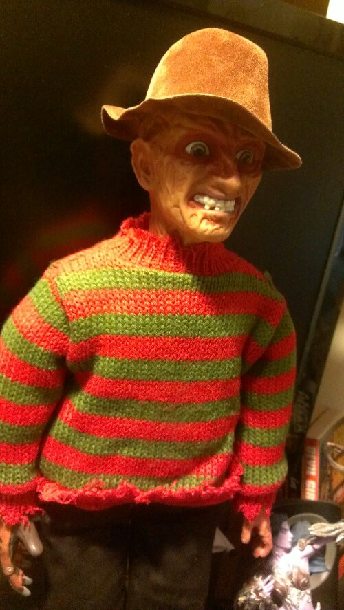 Sweet! I had forgotten that I pick this up a few years back. Mister Frederick Charles “Freddy” Krueger. This is number 1 of 30,000 made, the plastic wrap was all messed up. So I had to take it out and place it into a new one. But when I took Freddy out I felt a button on him chest! No way he talks?!?! Flipped him over and find the voice box with a on and off switch. Is funny.. When got this figure, I thought it was just a basic doll of Freddy. No where on the package says that he talks. He says 3 things. 1) that classic Freddy laugh 2) “Come to Freddy.” 3) “Ever play skin the cat?” Hearing Robert Englund voice made me feel like a little kid again lol. Growing up had odd hero’s haha, in am 80’s child need I say more?