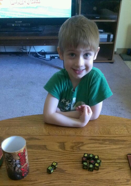 So I was play Zombie Dice with my son earlier today.. Needless to say, I got my but kick by a 3 year old hahaha! On one turn he rolled 9 brains! Was only shot twice….