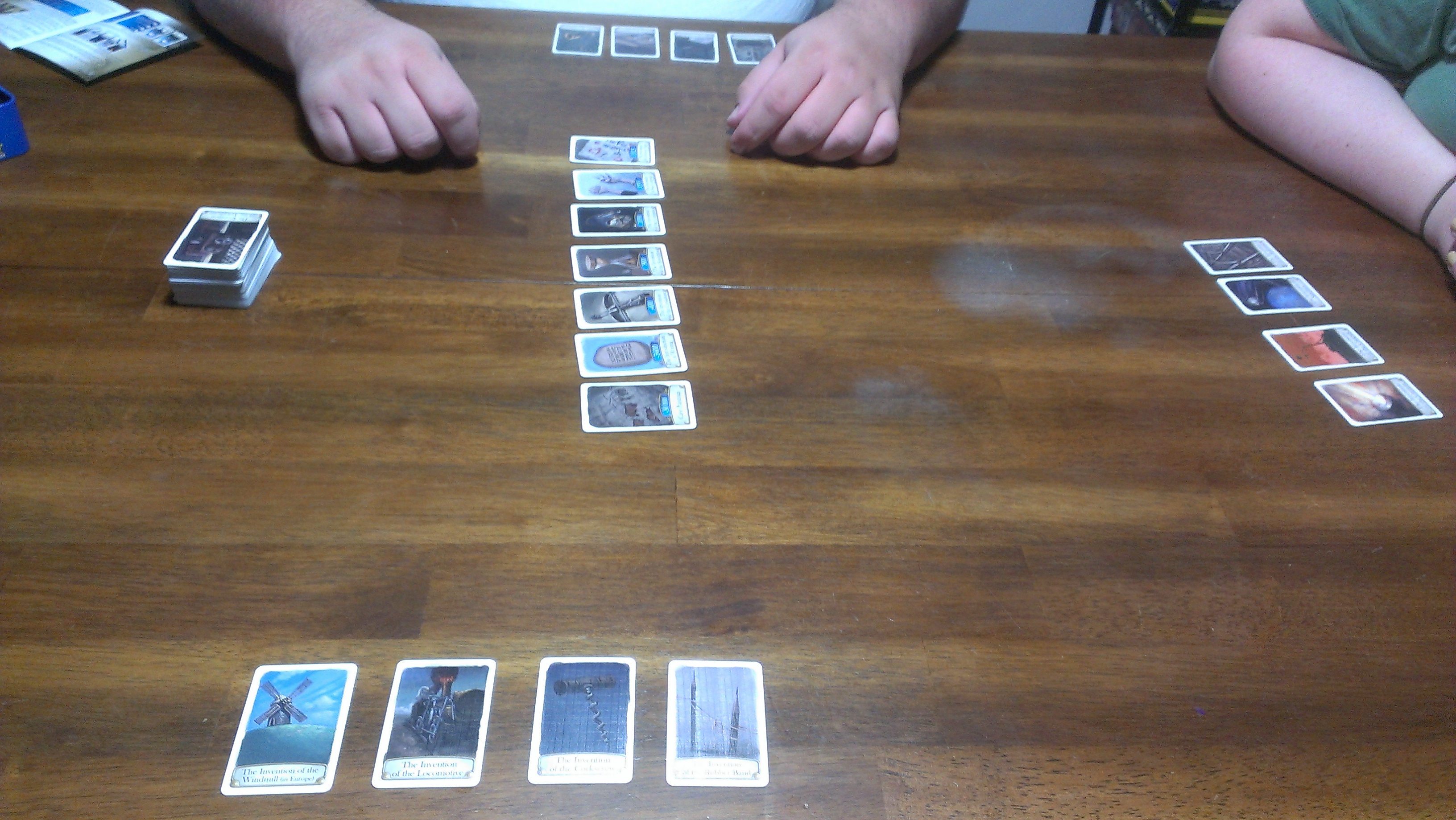 So this last Saturday we had TableTop night again! Play a new little game called Timeline: Inventions. Not a bad little game, it’s a filler for in between games. The idea behind it is you get these card face down with a picture of an invention on it. On the other side is the year in which it was made. Example: What year was the Rubber Band made? Answer: 1845. (Fun Fact: Currently, some 342 million red bands are used every year.) Once you answer the question you place the card in the Timeline before you in order. Description