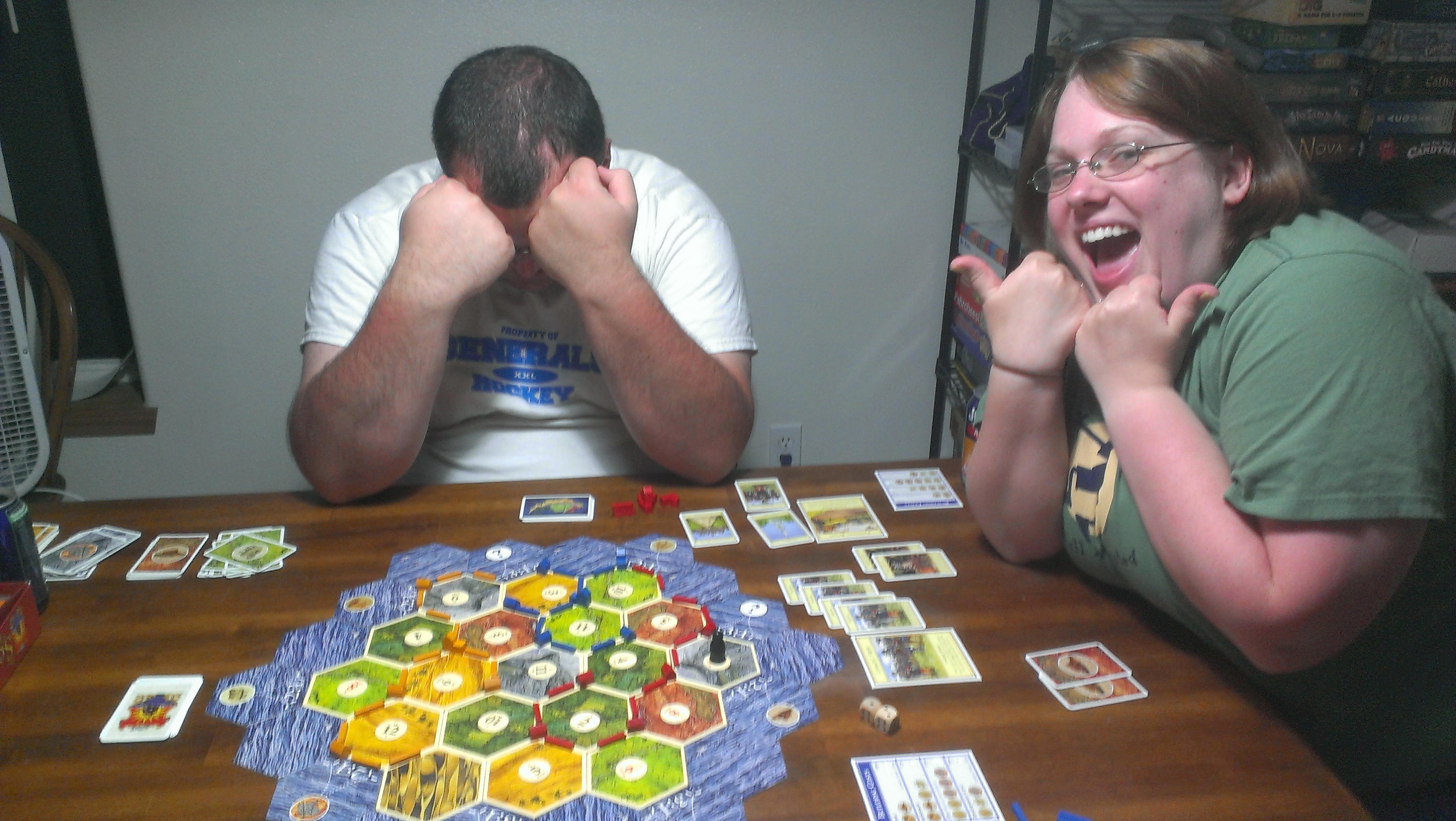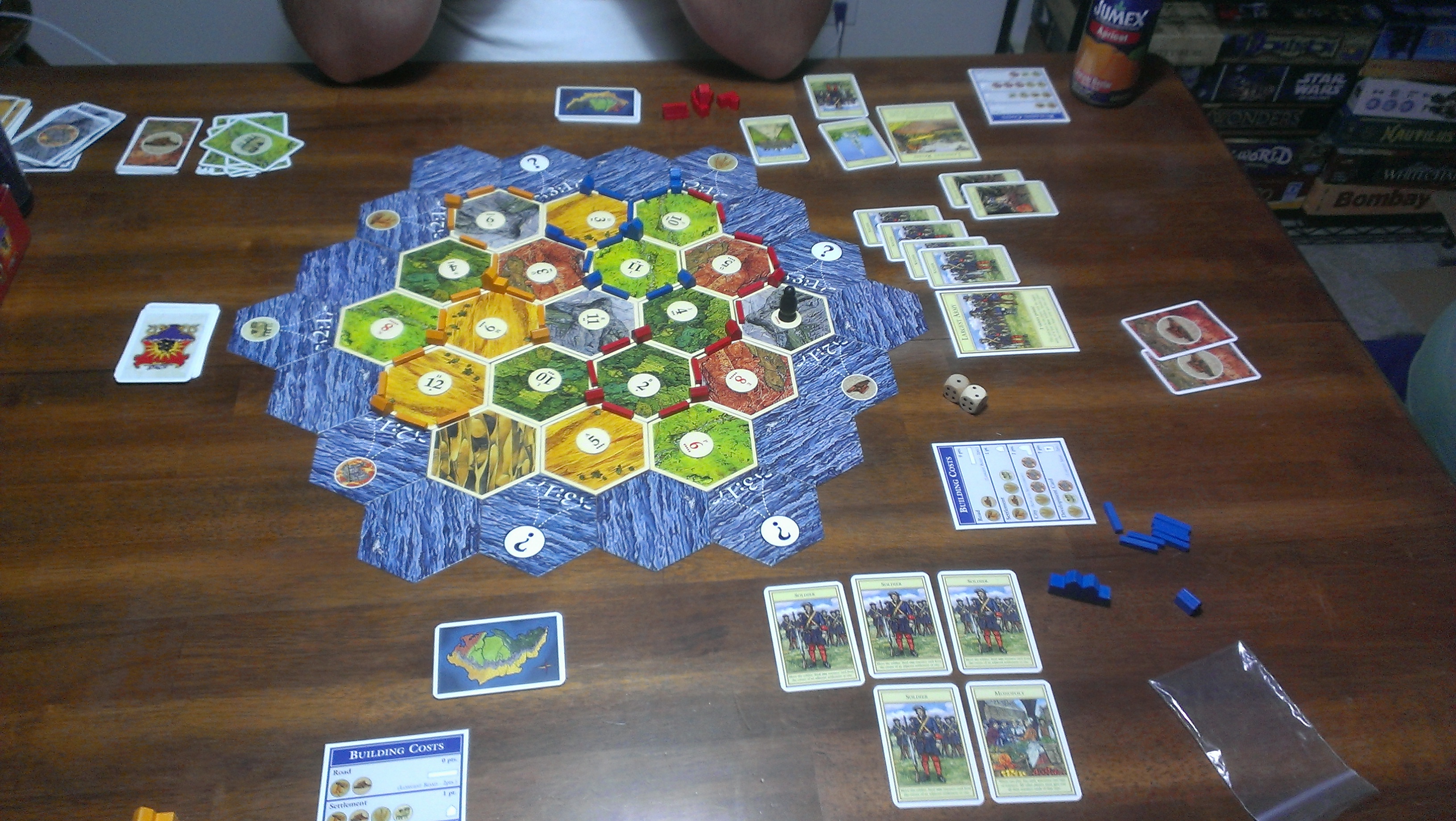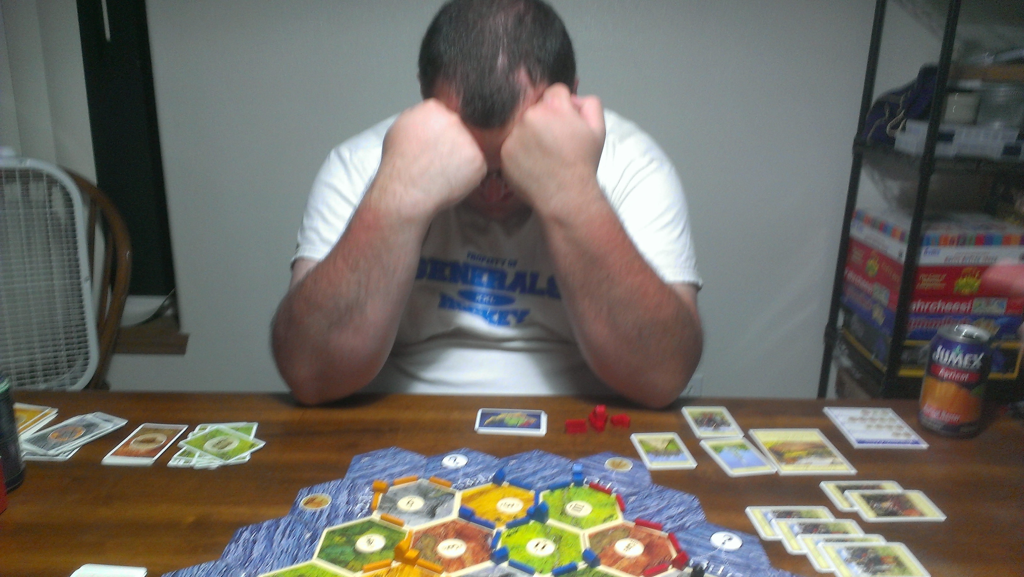 Next is the ever classic Settlers of Catan! I love this game, how can you not like this game. I HAVE WOOD FOR SHEEP!! Yes that the only time in someone’s life where it’s okay to say that HAHA. I almost had the game, I have the longest road and largest army. Only 2 points away from winning, I had it all taken away. Just didn’t have the Stone or Brink to build…. My gaming buddy (we’ll call him Care Bear for the time being.) Also had a horrible defeat, as you can see in the pictures below HAHA! In Settlers of Catan, players try to be the dominant force on the island of Catan by building settlements, cities, and roads. Each turn dice are rolled to determine what resources the island produces. Players collect these resources to build up their civilizations to get to 10 victory points and win the game.