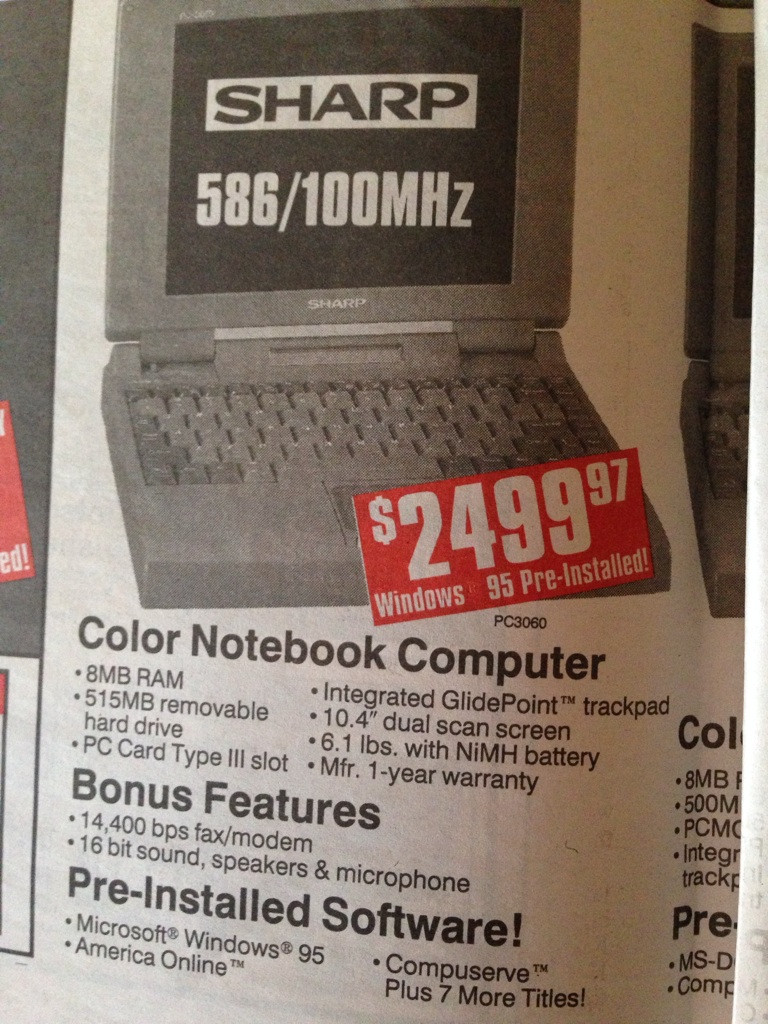 For $2500.00 you too can buy this Sharp Notebook! 515MB hard drive!? Haha! It’s amazing how far we’ve come over the past 20 years. I found a Toshiba laptop for $400.00 with a terabyte of memory over 8 gigs of ram.(Best Buy if you are wondering.) Heck my Note 3 is rocking a