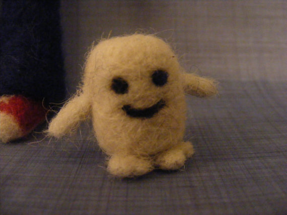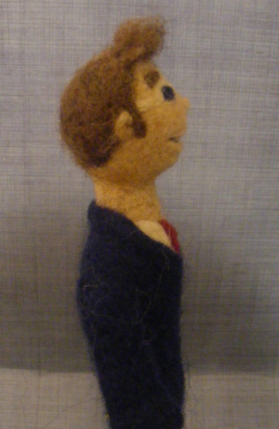 Included in this piece are the Doctor’s 3D timey whimey glasses, a small Adipose ( 1 inch tall), red converse, a removable felt trench coat (hand sewn at the seams not felted),and of course his sonic screwdriver.