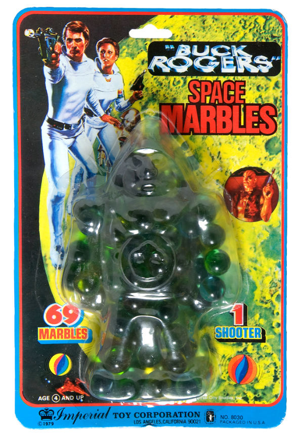 6.25×9.5” blister card contains 69 glass marbles and one shooter. Imperial Toy Corp. ©1979 Universal City Studios Inc. The high relief blister is formed to represent Twiki. Card has slight warp but remains clean and Exc. with Mint contents. Price: $25.00