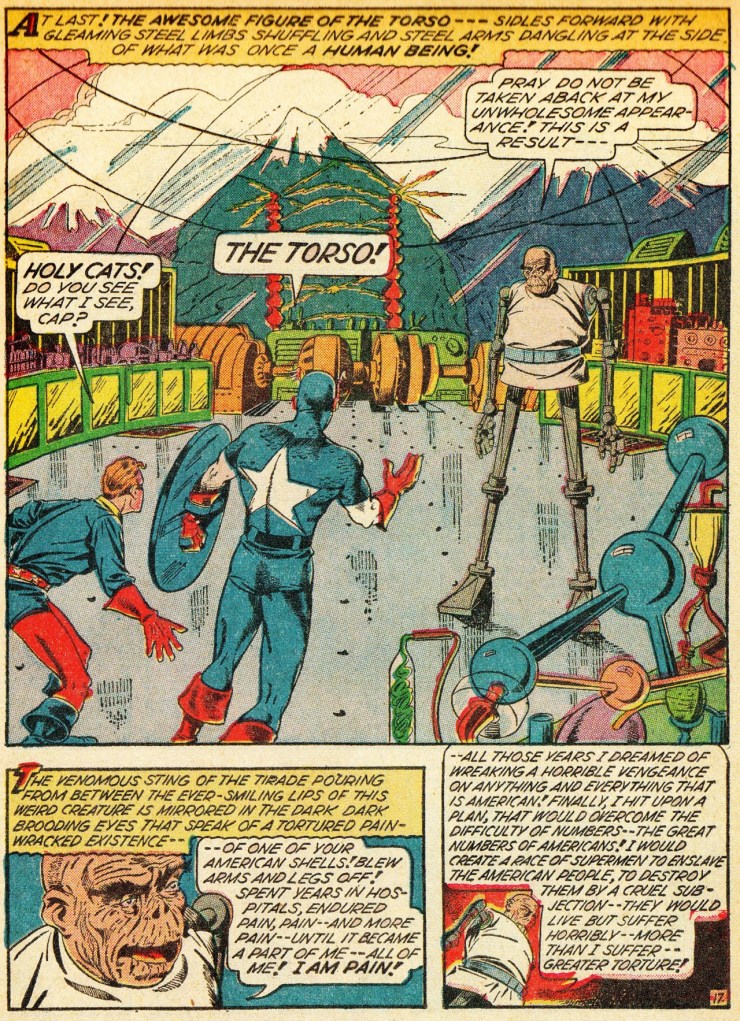 Art by Syd Shores & Vince AlasciaCaptain America had no shortage of villains all allied with the Axis powers. One of the most bizarre villains was Torso, whose loss of all his limbs in an explosion powers his desire to end the human race.