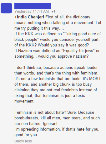 “First of all, you are missing the point you overly-privileged-white-man. Second of all, the women who hate men are called Misandrists (misandry is the hatred of men). Feminism has no relation of that [anymore]. Don’t go off on an unrelated tangent about Nazis and [the KKK], those were horrible things in history that shouldn’t be compared to something that is for women’s rights. Feminism fought for the right to vote, Feminism fought for women to get actual jobs, Feminism fought for women to join the Military, hell, Feminism fought for women to work in Congress and other Governmental jobs. Now we have a woman running for Office.