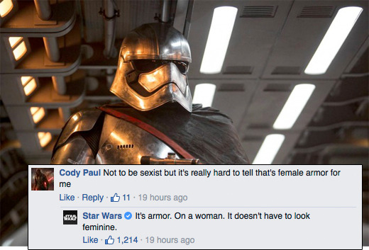 Star Wars is not here for your armor misconceptions. In a response that’s getting some digital ink, the official Star Wars page’s reply to a clueless comment on Phasma’s armor. Just say no to actually dangerous boob-plates!