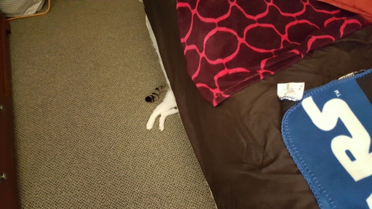 Severus likes to hide under the bed from time to time… But each time, he doesn’t seem to quite make it under the bed. Everyday with this guy…… I just need to get a video of him with his A.D.D speed craziness.