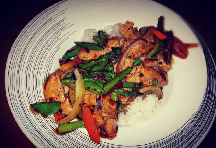 Made a grilled chicken with mix vegetables and asparagus. Lightly cooked with a General Tso sauce and coconut milk white rice. #foodie #food #foodporn #asian #chef (at 1847 Bar & Grill)
