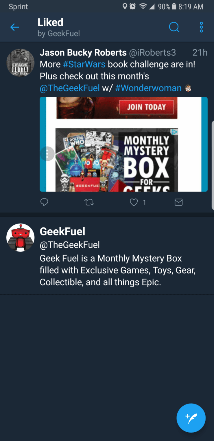 It’s the little things that can make you smile. Or Geek out! Earlier I tweeted out But my Star Wars Book Challenge and it was also sponsored by this month’s Geek Fuel mystery box.. Didn’t think much of it, till they wrote back and like my tweet..