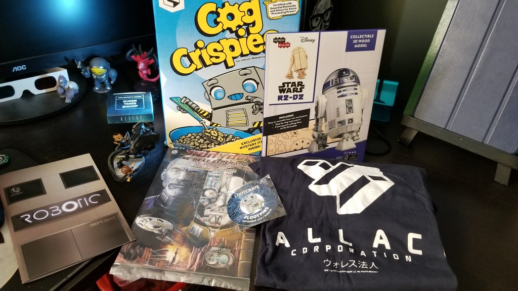 So after taken a few months away from any form of Loot (plus I got burned out on all the shipping issues I was having with a certain company). I went out and got this months LootCrate! This month was Robotic theme and it was amazing :). We have Aliens, Star Wars, Star Trek (I know!! I the same box!!), Blade Runner!! Now that is just the core crate, the DX has far more Loot inside.