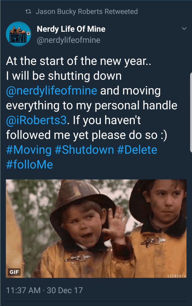 So as it states above. I’ll be closing the Twitter handle for Nerdy Life Of Mine and moving everything over to my personal one. Reasons for doing this was to make things easier for myself and less accounts to deal with. Plus I don’t check Nerdy Life Of Mine’s messages enough to make it fully active. Finding messages from people 4 to 8 months ago sucks. SO! Everything is being moved to @iRoberts3. Please make sure to follow me if you haven’t already!