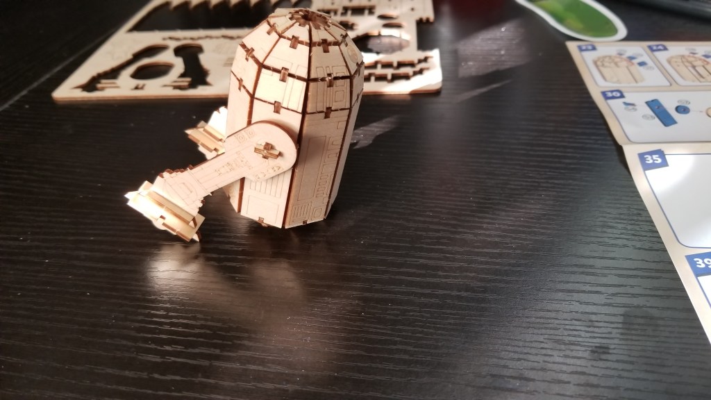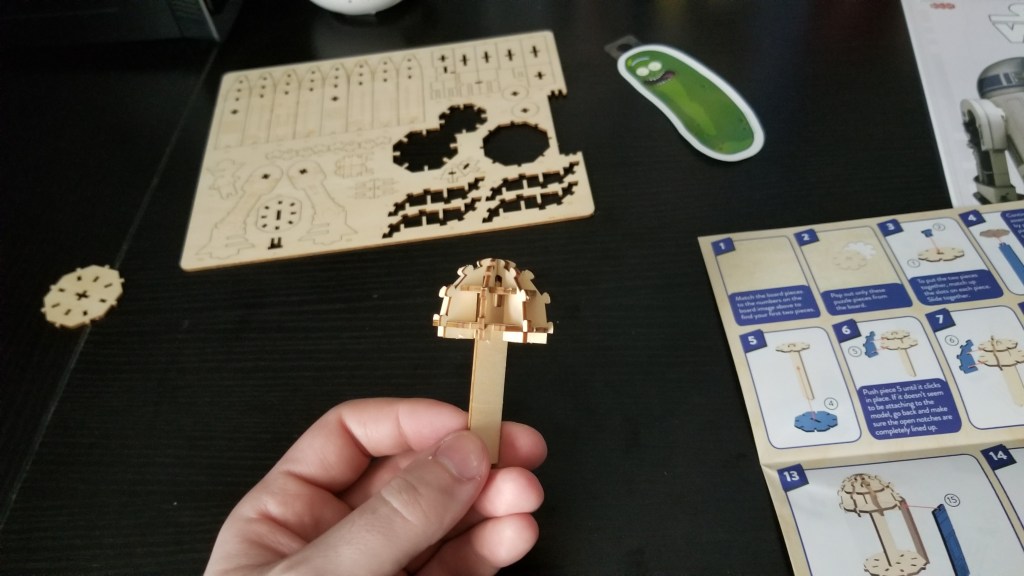 The whole thing was rather fun to put together. Rather easy as well. The only problem I ran into was making the top parts fit. I found myself cutting down some of the wood to make them fit better. Aside from that I’m happy with it, was thinking about painting it.. Maybe another time I will do that. (Yes that is a Pickle Rick in the background..)