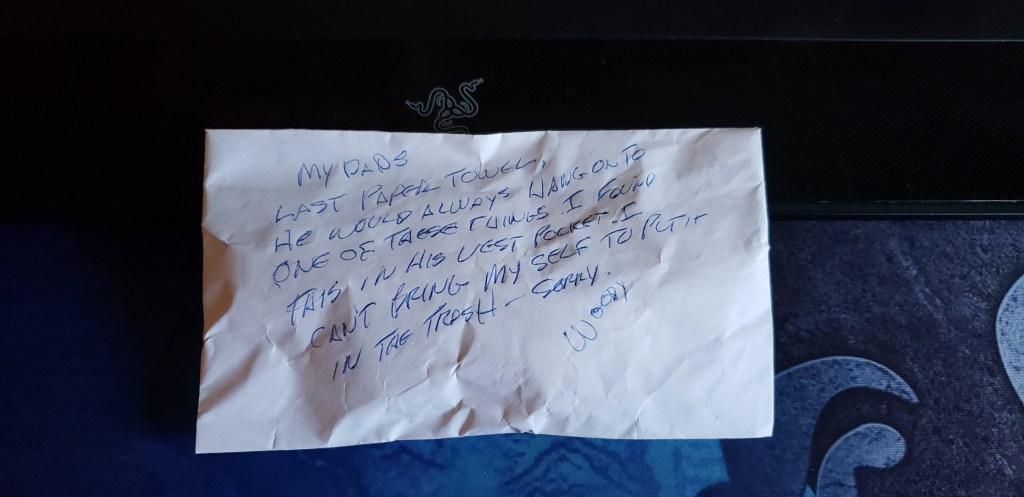 If you can’t read it, it says,”My Dad’s last paper towel, he would always hang on to one of these things. I found this in his vest pocket. I can’t bring myself to put it in the trash… Sorry. -Woody”