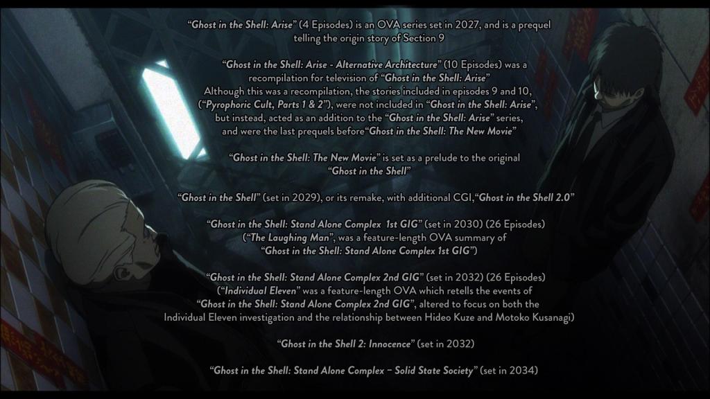 The TV shows and movies are something that I hold close. Personally I feel this is cyberpunk in it’s purest form of the word. Now there is a number of different stories released within the shows and movies and sadly some of them are out of order. So after digging around the interwebs, I found one of the most accurate lay outs on Reddit.