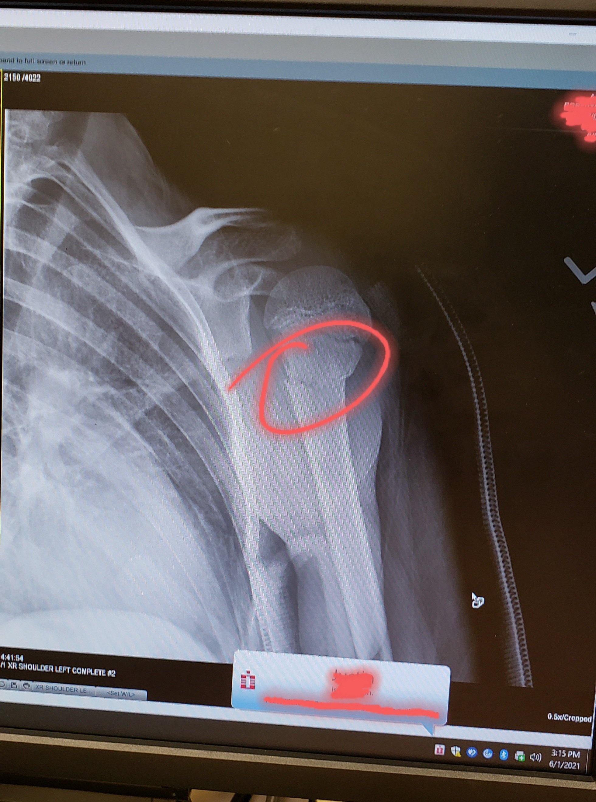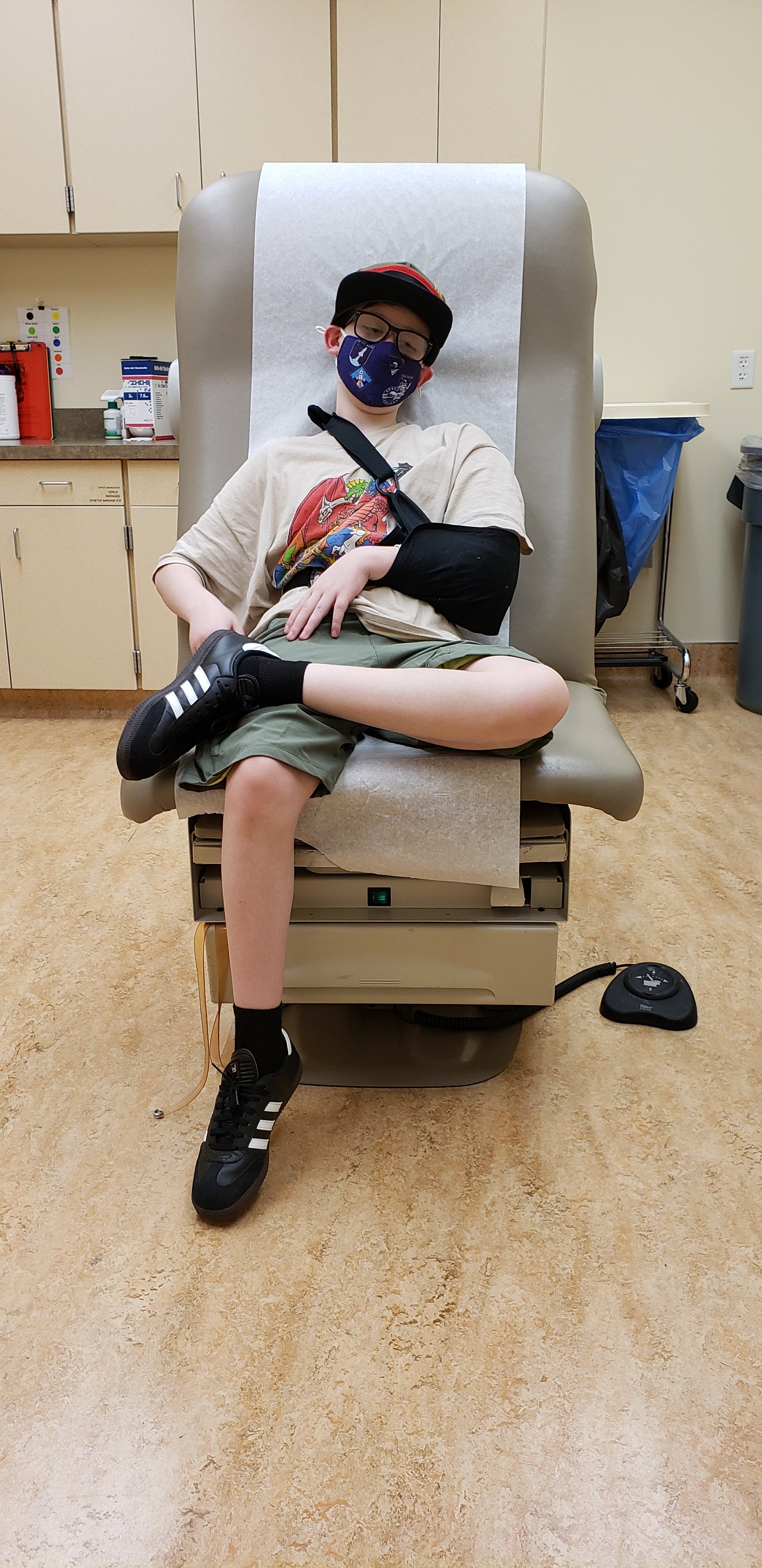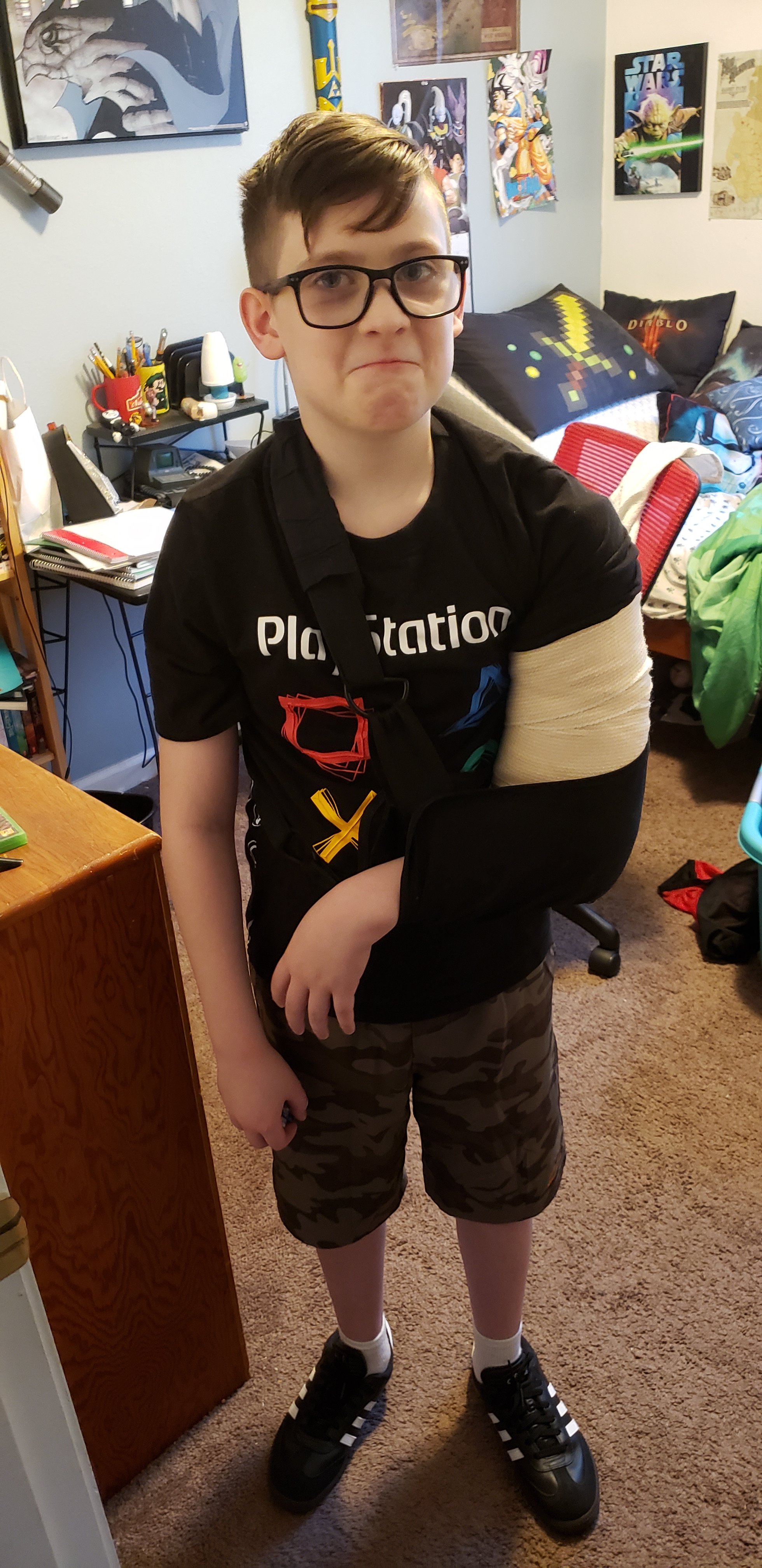 It seems that at some point of playing around. He thought it would be a good idea to do a front flip from the bouncy house opening to the slide that was build on. Not being able to stick the landing the way he wanted too. He did land on his arm and bend it backwards… After he was able to move, we took him the the local ER to see if there was more damage than we were seeing.