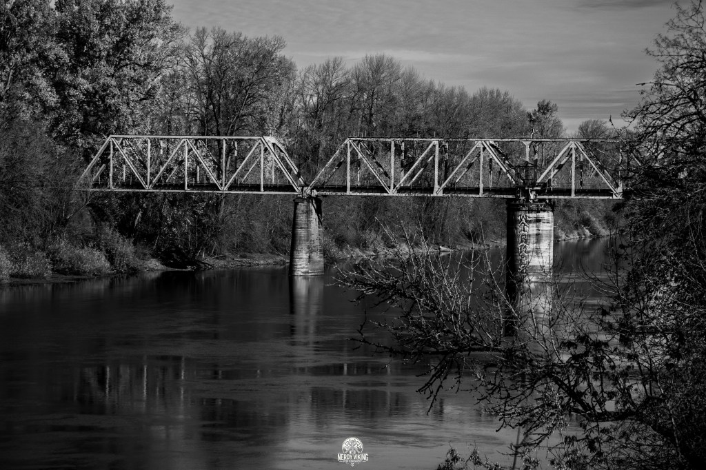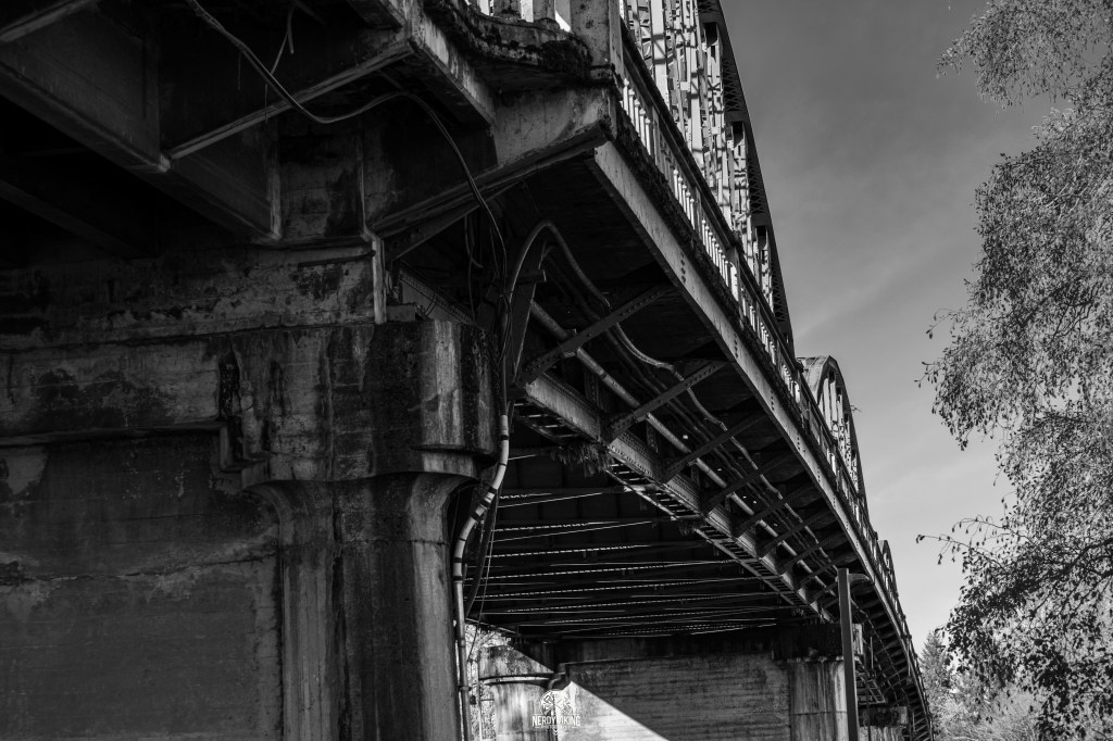 I started under the old bridge, the iron beast that’s been holding this place together for decades. Up close, it looks like something out of a forgotten chapter of American decay: rust, graffiti, bolts loosened by time and neglect. The kind of industrial skeleton that hums with stories no sane person would want to hear. The shadows there are thick, almost oily, and every sound echoes like an accusation.