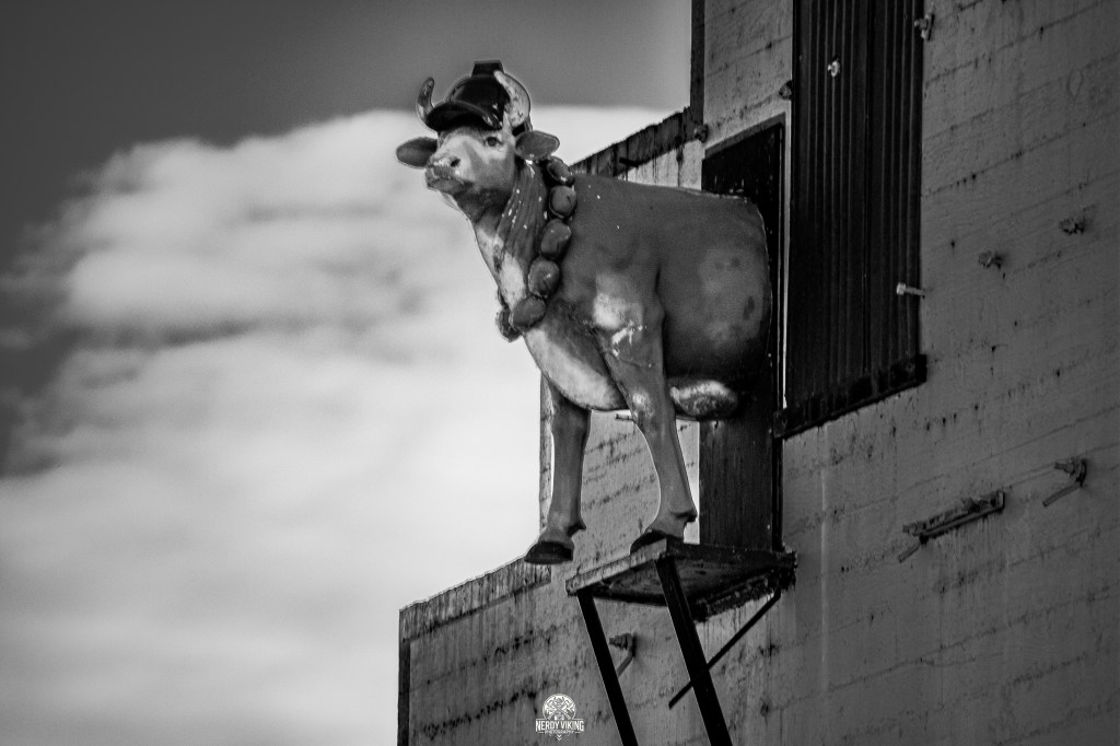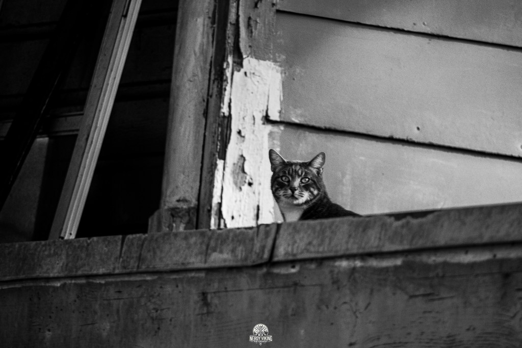 There’s always a witness in these back-alley odysseys. Today it was a cat perched in the busted-out window of a derelict building, eyes sharp, calm, judging me like I was just another trespasser in its kingdom of peeling paint and rotted wood. A little king of the forgotten places. Every town has one.