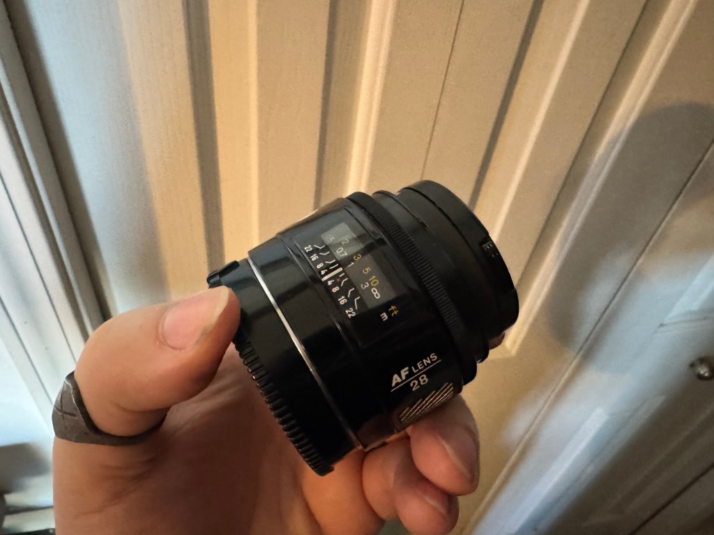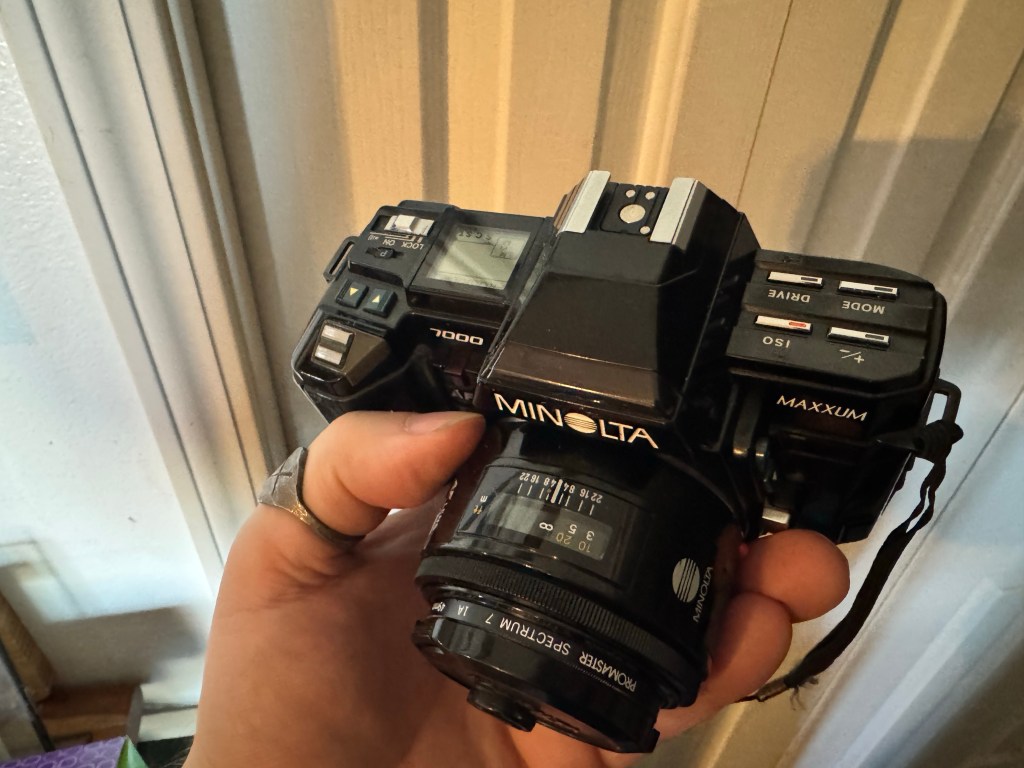 Rebecca hands me this black, angular relic — the Minolta Maxxum 7000 — and suddenly it’s 1985 again. Synth music in the background. Shoulder pads wide enough to land aircraft. The Cold War humming softly under fluorescent lights.